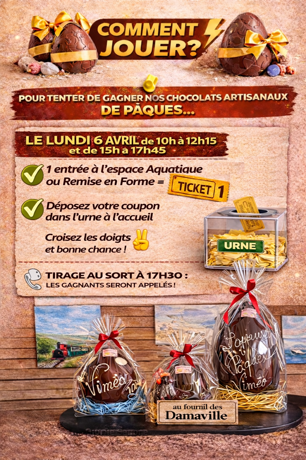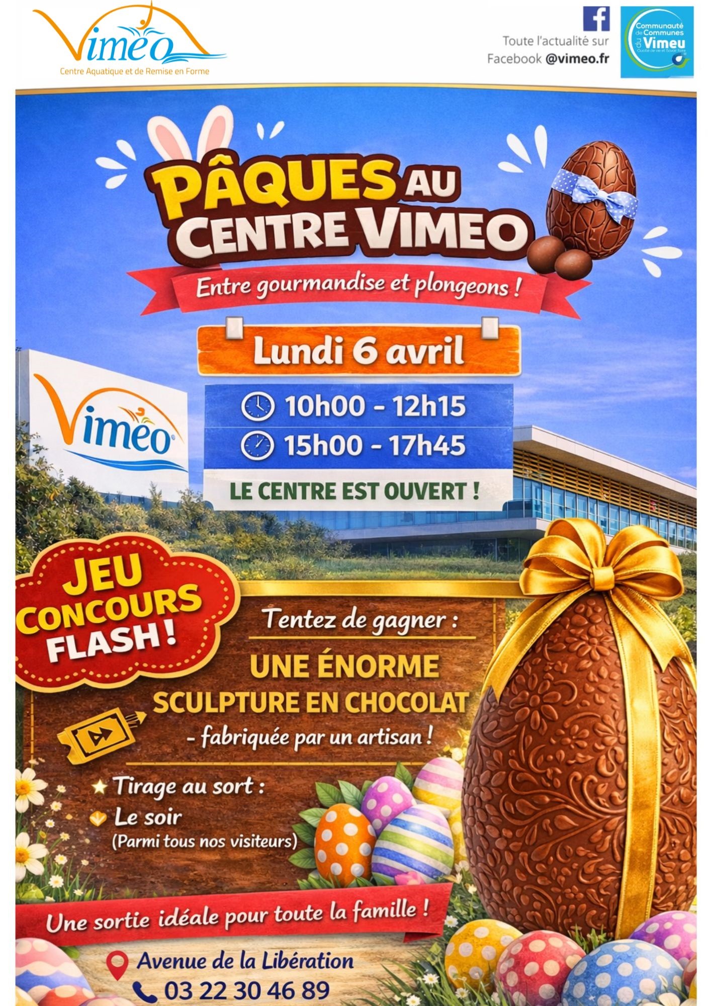 Jeu du lundi de Pâques l.delahaye2026-04-03T13:57:13+00:003 avril 2026| Partagez ! FacebookTwitterGoogle+PinterestEmail Related Posts Gallery Vacances de Printemps 10 avril 2026 Gallery Week end de Pâques 3 avril 2026 Gallery Pâques au centre VIMÉO ! 24 mars 2026 Gallery Stage de natation – Vacances de printemps 17 mars 2026 Gallery Ligne téléphonique Indisponible 11 mars 2026